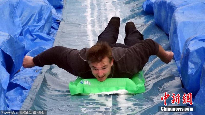 2014年3月12日消息,英国,艺术家Luke Jerram设计了一个长达90米的超长滑水装置,街道瞬间变身游乐场。图片来源:CFP视觉中国