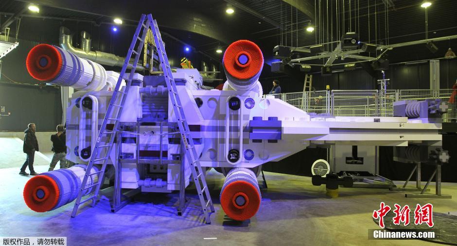 当地时间2014年3月12日,德国根斯堡附近的乐高主题公园中,技术人员正在拼装“乐高星球大战X翼战机”飞船。这一飞船是用500万块乐高积木组建而成,拥有一个13米长的机翼,被认为是世界最大的乐高模型。