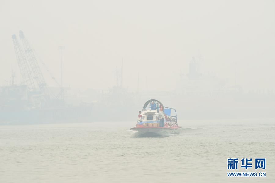 3月14日,在马来西亚巴生港,一艘快艇在海上行驶。马来西亚的烟霾情况持续严重,根据马来西亚环境局在网上所提供的数据显示,吉隆坡以西的巴生港空气质量受到严重影响,空气污染指数到中午时段已经达到非常不健康的水平。新华社发(张纹综摄)