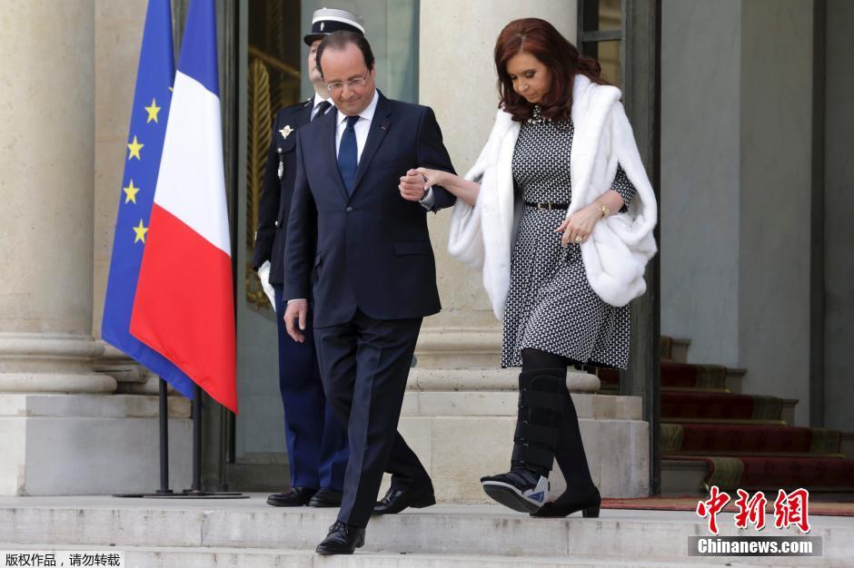 阿根廷美女总统“带伤”出访法国 奥朗德搀扶显绅士