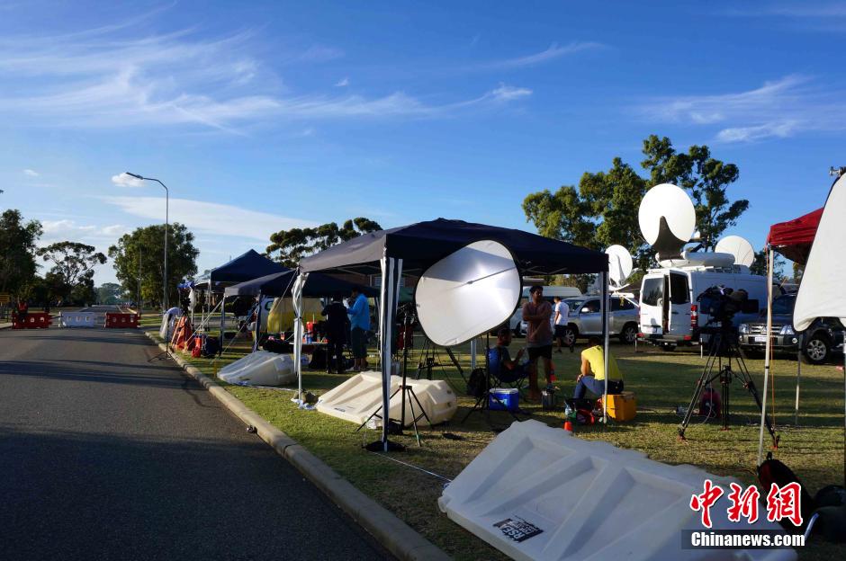 马航客机失踪第17日,在澳洲珀斯皮尔斯皇家空军机场,连日来大批媒体聚集,跟进马航失联班机事件。图为媒体架桥帐篷和设备就地播发新闻。中新社发 洪少葵 摄