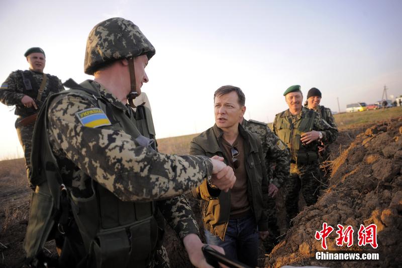 当地时间2014年3月24日,乌克兰议员Oleh Lyashko视察乌克兰与克里米亚边境地区的军队,为乌克兰士兵打气。乌克兰政府下令该国武装部队撤出克里米亚。