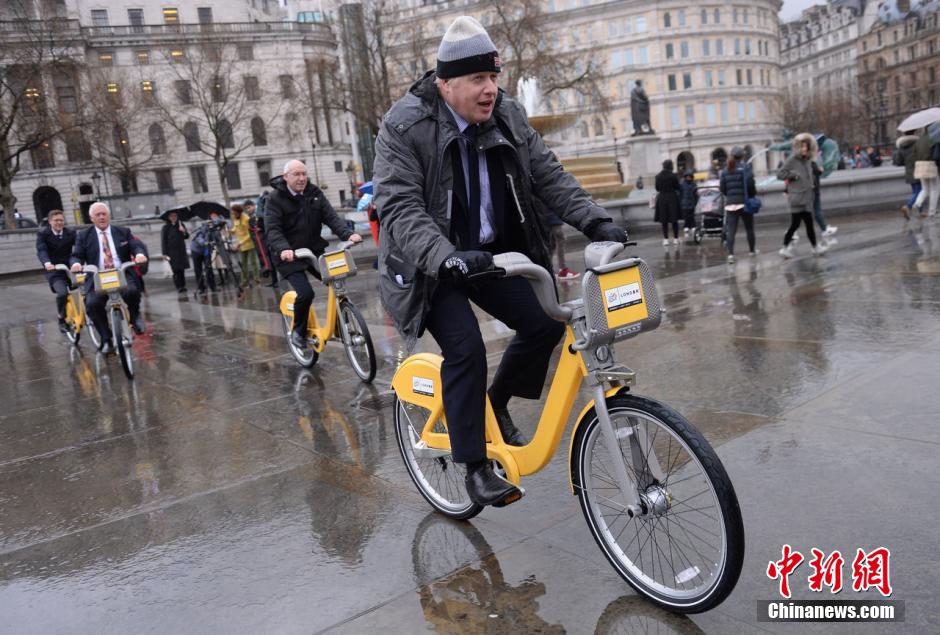 当地时间3月26日,伦敦市长鲍里斯·约翰逊骑单车亮相街头,为“巴克莱自行车出租计划”(Barclays Cycle Hire)宣传助阵。据悉,该计划是伦敦交通局为在伦敦中心作短途旅程推出的新自助公共自行车分享计划。