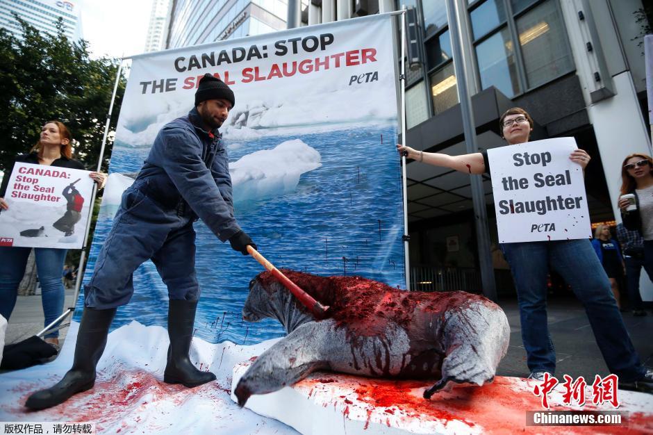 当地时间2014年3月31日,美国洛杉矶,善待动物组织活动家在加拿大领事馆前模仿海豹屠宰行为,抗议猎杀海豹。尽管海豹制品已经没有什么市场需求,加拿大政府仍一年花费约700万美元对商业海豹猎杀进行补贴,成千上万的小海豹因此被屠杀。