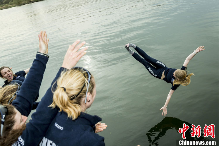 当地时间3月30日,英国,传统的牛津-剑桥赛艇对抗赛举行,牛津女队取得今年的胜利。赛后牛津女队队员威索基·琼斯被队友扔进泰晤士河,享受胜利的喜悦。