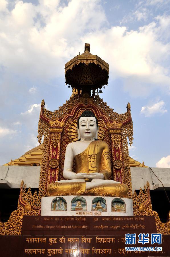 这是4月8日在印度孟买拍摄的世界内观佛塔旁边的释迦摩尼佛像。 位于印度最大城市孟买西北部的世界内观佛塔是仿造缅甸仰光著名的大金塔修建的佛教建筑。该塔高达97.46米,于2000年开建,2008年落成,佛塔目前供佛教徒和参观者用于内观、冥想、打坐等修行活动。内观是印度古老的禅修方法,通过观察自身来净化身心。新华社记者汪平摄
