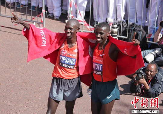 4月13日,两位肯尼亚选手包揽伦敦马拉松赛男子组冠亚军。世界记录保持者、肯尼亚选手基普桑(左)赢得男子组冠军,并以2小时4分29秒的成绩创造了伦敦马拉松赛历史上的最好成绩。另外一名肯尼亚选手比沃特(右)获得亚军。中新社发 周兆军 摄
