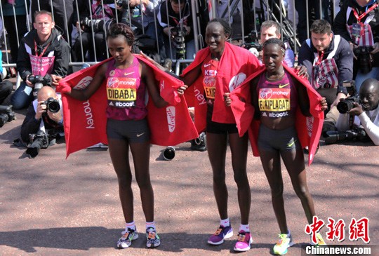 4月13日,肯尼亚选手埃德娜·基普拉加特(中)获伦敦马拉松赛女子组冠军,另一位肯尼亚选手弗洛伦斯·基普拉加特(左)获得亚军,埃塞俄比亚选手蒂鲁内什·迪芭芭(右)名列第三。中新社发 周兆军 摄