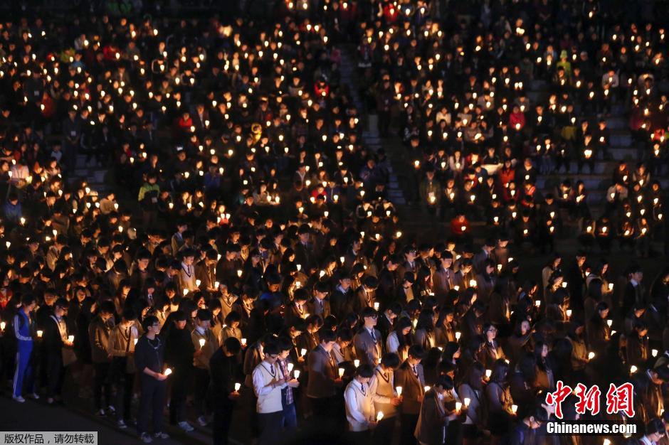 当地时间2014年4月19日,韩国安山,高中生和市民在公园里参加烛光守夜,为“岁月”号失踪乘客祈福。载有476名乘客的韩国“岁月”号客轮16日在韩国全罗南道珍岛郡屏风岛以北海域发生意外进水事故并最终沉没。目前遇难人员已达49人,此外,仍有250余人下落不明。失踪人员中包括4名中国公民。