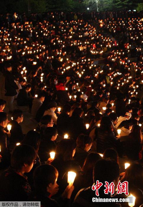 当地时间2014年4月19日,韩国安山,高中生和市民在公园里参加烛光守夜,为“岁月”号失踪乘客祈福。载有476名乘客的韩国“岁月”号客轮16日在韩国全罗南道珍岛郡屏风岛以北海域发生意外进水事故并最终沉没。目前遇难人员已达49人,此外,仍有250余人下落不明。失踪人员中包括4名中国公民。