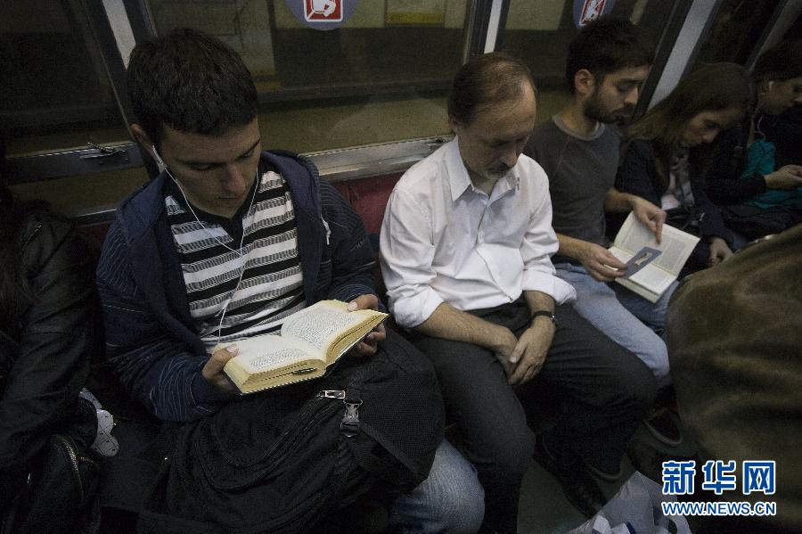 4月22日,乘客在阿根廷布宜诺斯艾利斯地铁里读书。新华社发(马丁·萨巴拉摄)