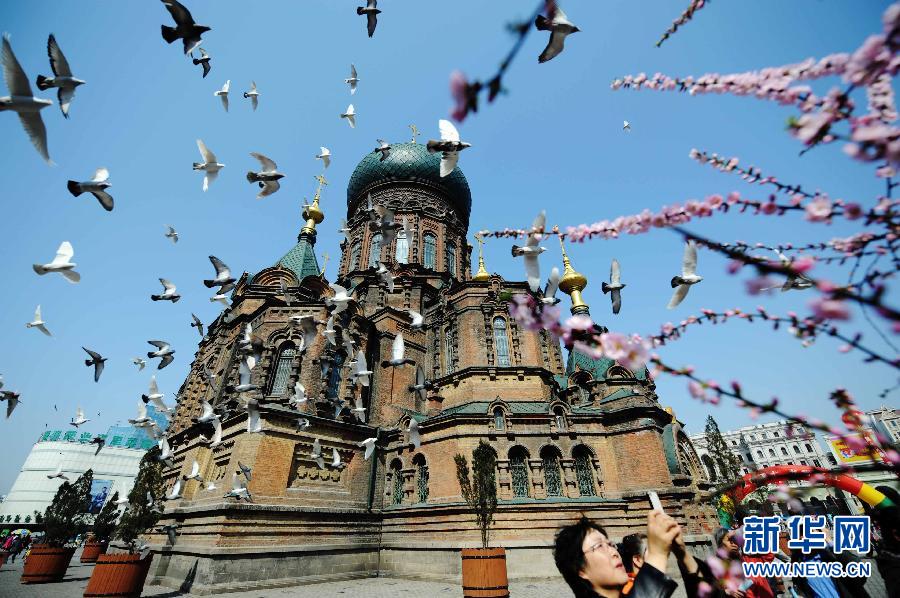 4月23日,游人在圣索菲亚教堂一侧拍照。新华社记者王建威摄