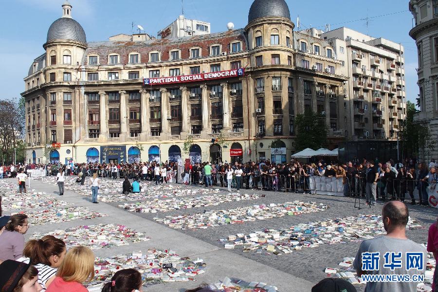 4月23日是“世界图书和版权日”。布加勒斯特当地一家出版社举办“图书开放之夜”,在市中心大学广场上摆放一万册图书供市民免费领取。新华社发(佩特雷斯库摄)