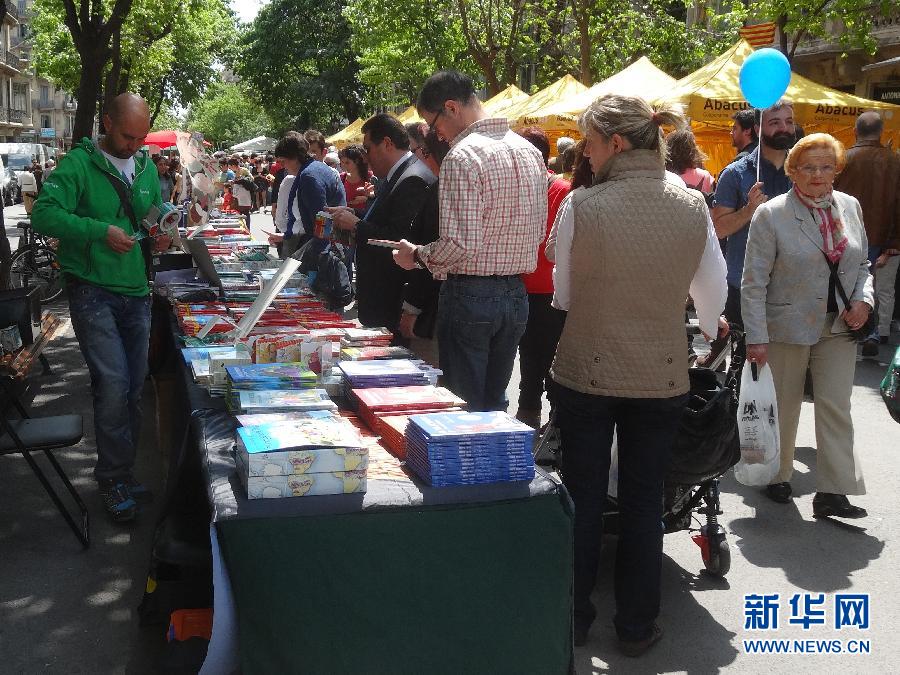 当天是“世界读书日”,也是西班牙加泰罗尼亚地区的传统节日“圣乔治节”。在巴塞罗那市中心的加泰罗尼亚广场周围以及兰布拉大街上,临时搭建起很多卖书或者卖花的摊位。大街上随处可以见到手持鲜花的女士,还有拎着一口袋书的男士。设立世界读书日的灵感就是源自“圣乔治节”。根据风俗,节日当天男士会向女士赠送一朵玫瑰,以示骑士风度;作为回馈,女士会赠送男士一本书籍,象征知识与力量。新华社记者周喆摄