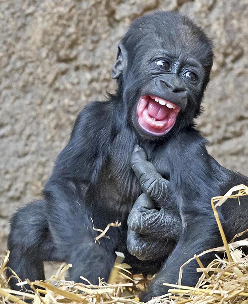据英国《每日邮报》4月24日报道,猩猩一直被认为是与人类最相似的动物。它们会笑、会哭、会与家人建立感情、还会使用各种工具。德国莱比锡动物园一只仅5个月大的小猩猩Jengo近日就被大猩猩们逗得笑个不停。只见,Jengo的眼睛一亮,咧开嘴,露出几颗小牙,看上去可爱极了。