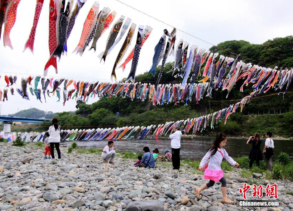 4月29日,在日本东京郊区的相模原,孩子们在鲤鱼旗下玩耍。当日,日本东京郊区相模原的河边悬挂起约1200条鲤鱼旗,迎接即将到来的儿童节。日本把5月5日作为男孩的“儿童节”,挂鲤鱼旗的风俗始于江户时代,祈愿孩子出人头地。