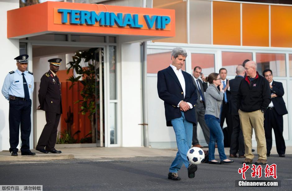 当地时间2014年5月5日,佛得角萨尔岛,美国国务卿克里在飞机加油间隙秀足球脚法。据悉,克里将结束对非洲的访问返回华盛顿。