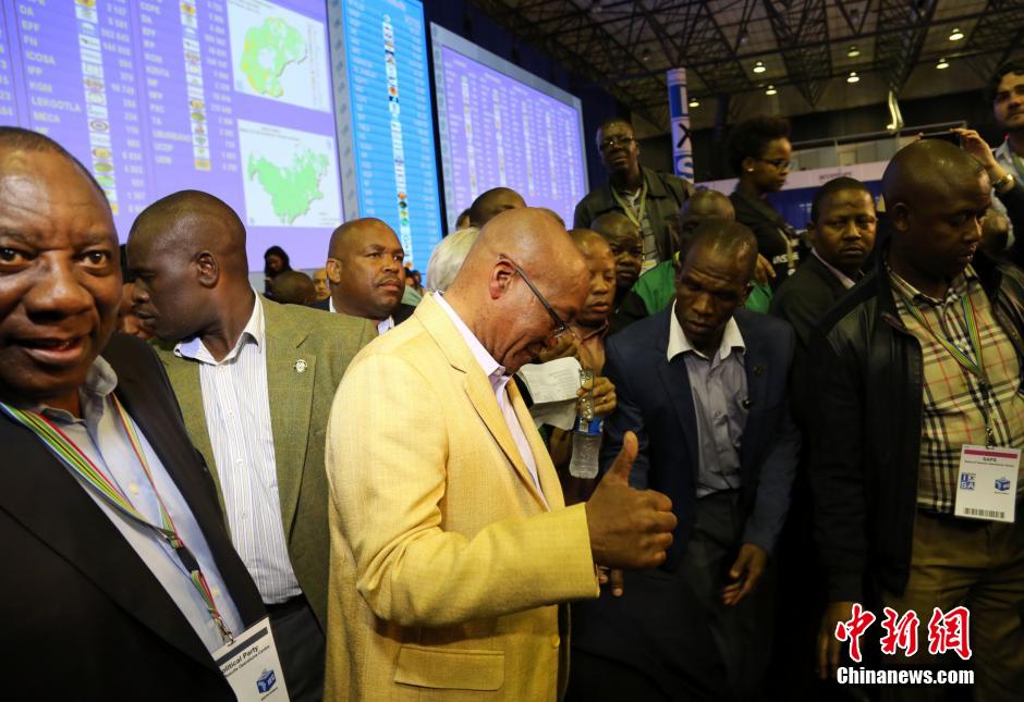 南非第五次全国大选于2014年5月8日开始计票。经过整整一天的统计,执政党非洲人国民大会(非国大)的得票数已经超过总有效票数的50%,提前锁定胜局。同时,非国大也将继续获得南非9个省中的8个的执政地位,而民主联盟则继续其在西开普省的执政地位。当晚8时许,南非总统祖马赶到大选运行中心,看望各政党代表并与支持者欢庆胜利。图为南非总统祖马现场竖起大拇指。中新社发 宋方灿 摄