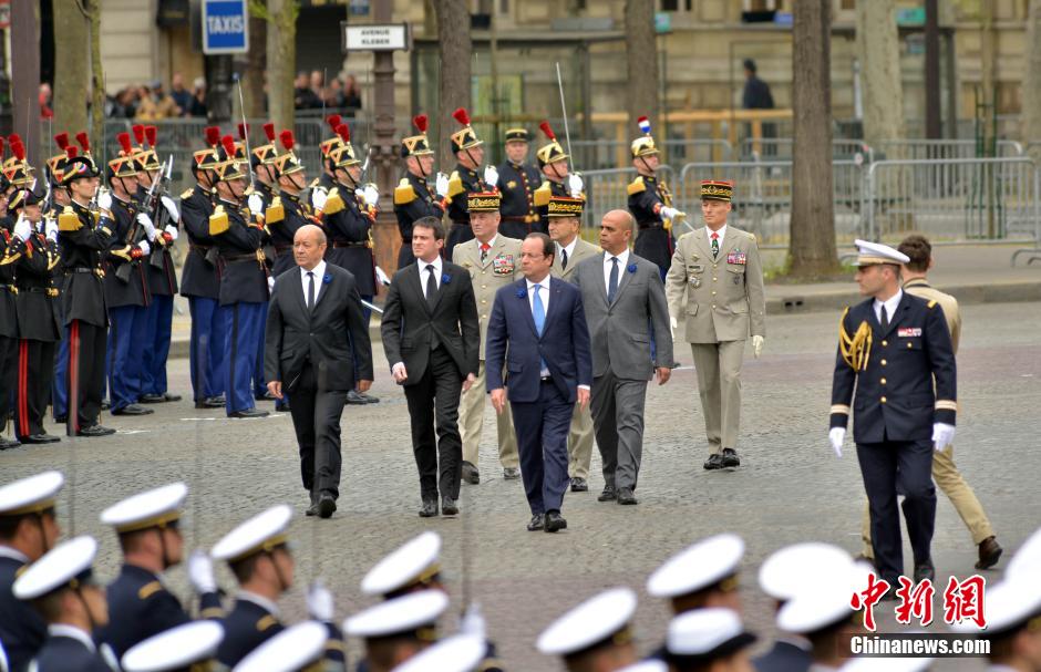 5月8日第二次世界大战欧洲胜利日,法国政府在巴黎凯旋门举行纪念活动,奥朗德总统出席仪式。图为凯旋门广场上,奥朗德在总理瓦尔斯(左二)、国防部长勒德里昂(左一)陪同下检阅仪仗队。中新社发 龙剑武 摄