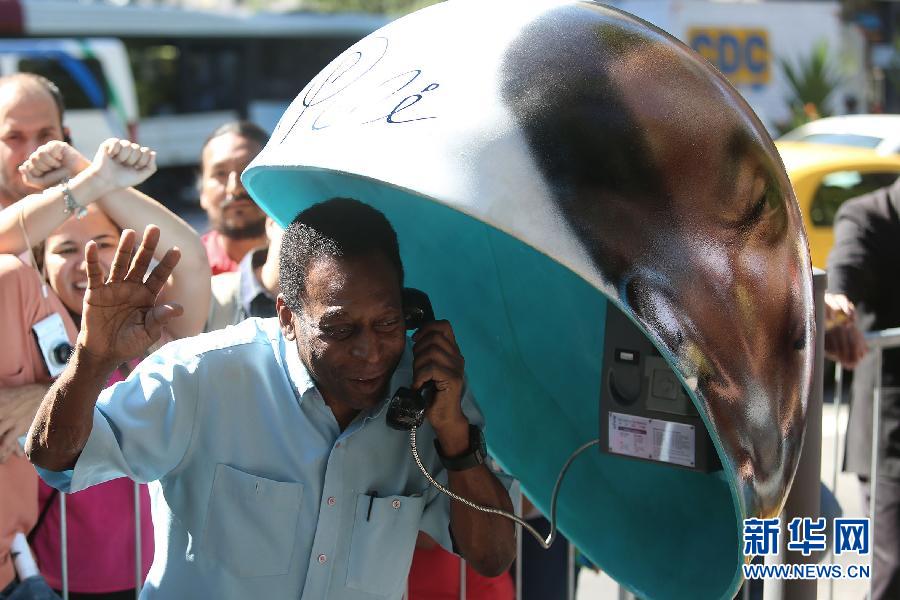 当日,巴西圣保罗街头的公用电话亭焕然一新,印上了巴西足球队的颜色和贝利的形象,迎接世界杯的到来。 新华社发
