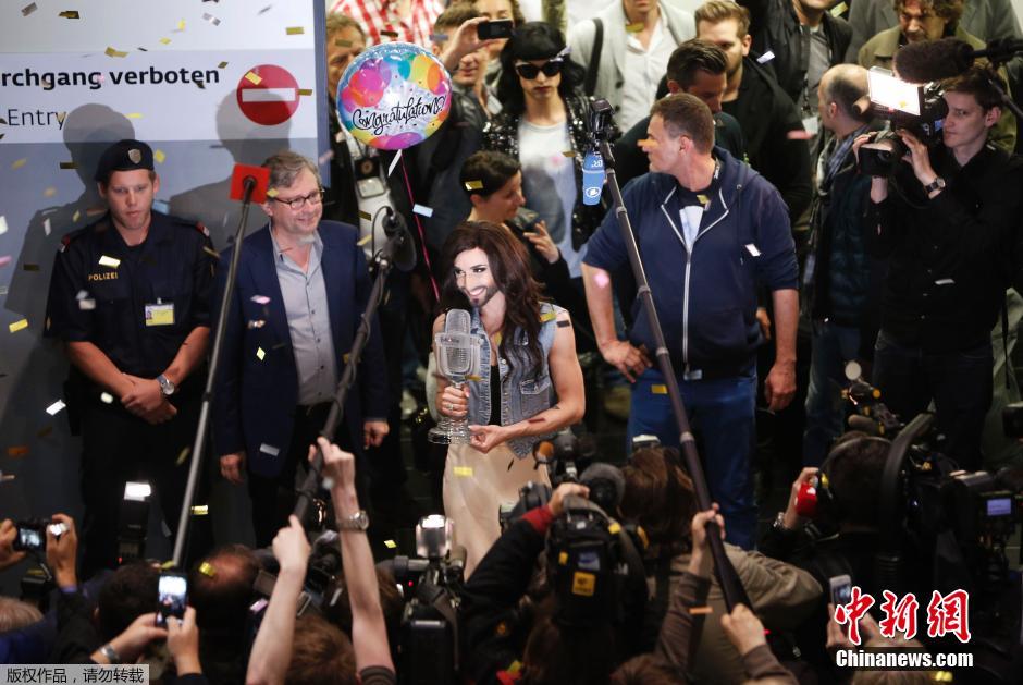 5月11日,在奥地利维也纳机场,“大胡子小姐”孔奇塔·武斯特回国现身机场受热捧。有“大胡子小姐”之称的孔奇塔·武斯特10日在丹麦哥本哈根赢得2014年欧洲电视网歌唱大赛的冠军,并在11日返回奥地利时受到了支持者的热烈欢迎。欧洲电视网歌唱大赛被称为欧洲级别最高、举办时间最长的歌唱比赛之一。孔奇塔·武斯特原名汤姆·诺伊维尔特,其身份以及变装皇后的形象在比赛过程中饱受争议。奥地利右翼政党奥地利自由党领导人称孔奇塔获胜“荒谬”。奥地利总统菲舍尔则称武斯特获胜是宽容在欧洲的胜利。