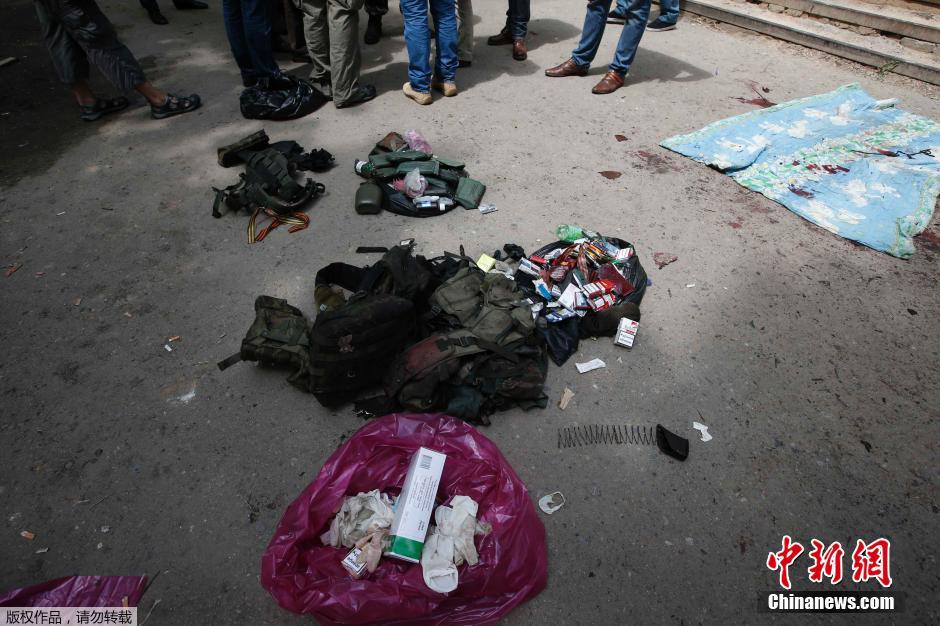 当地时间2014年5月27日,顿涅茨克,民众站在太平间外看着死亡的武装份子遗留下的财物。据了解自乌克兰出动飞机与空降部队,对东部城市顿涅茨克的亲俄民间武装人员发动空前猛烈攻势,2天战事已知有超过50名武装人员丧生。