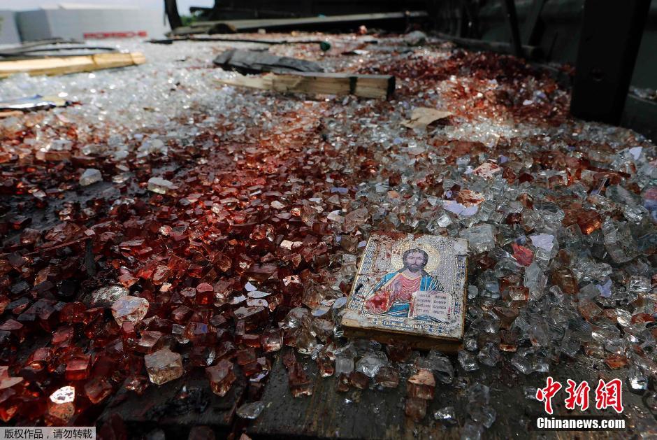 当地时间2014年5月27日,顿涅茨克,一副被血染红的耶稣画像。据了解自乌克兰出动飞机与空降部队,对东部城市顿涅茨克的亲俄民间武装人员发动空前猛烈攻势,2天战事已知有超过50名武装人员丧生。