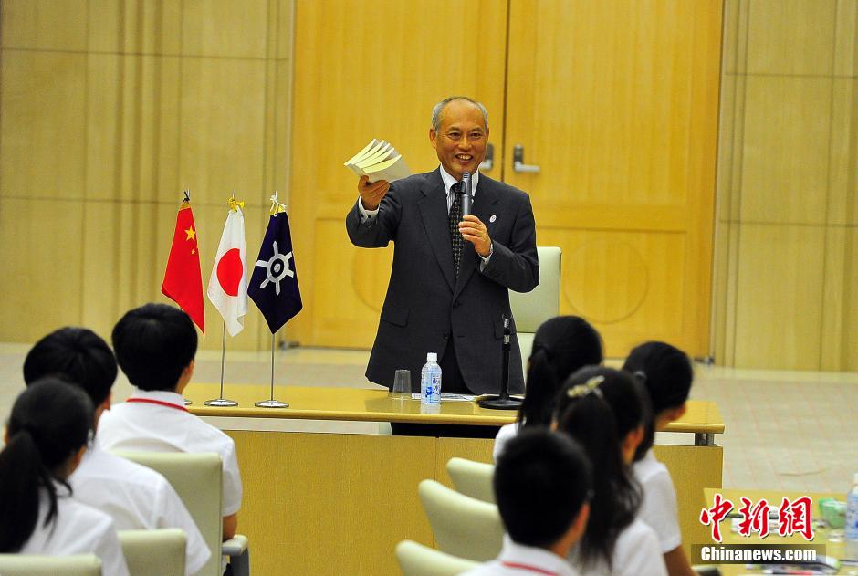 7月11日,日本东京都知事舛添要一在东京都厅会见前来日本参加2014“中日小大使”交流活动的部分中国高中学生。图为舛添向来访的中国学生赠送其撰写的书籍。中新社发 王健 摄