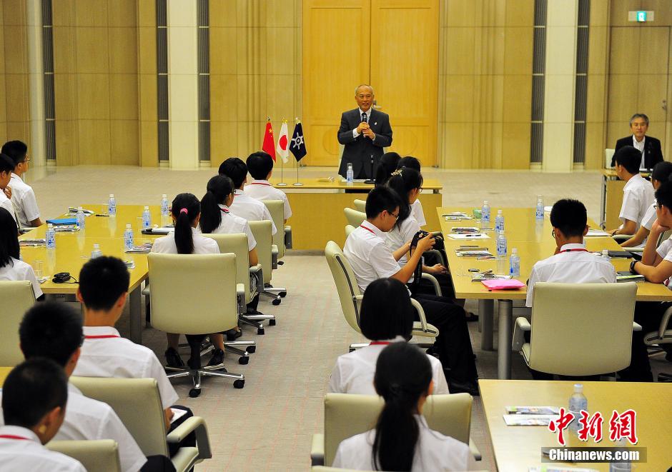 7月11日,日本东京都知事舛添要一在东京都厅会见前来日本参加2014“中日小大使”交流活动的部分中国高中学生。图为舛添向来访的中国学生赠送其撰写的书籍。中新社发 王健 摄