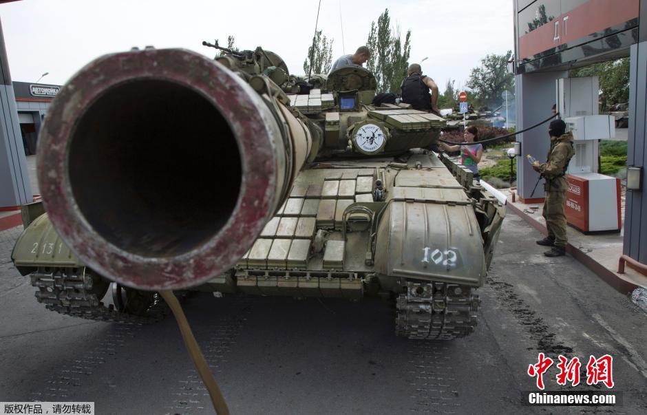 当地时间7月17日,顿涅茨克地区,“顿涅茨克共和国”士兵在街头给坦克加油,一位女孩在加油站帮助他们。