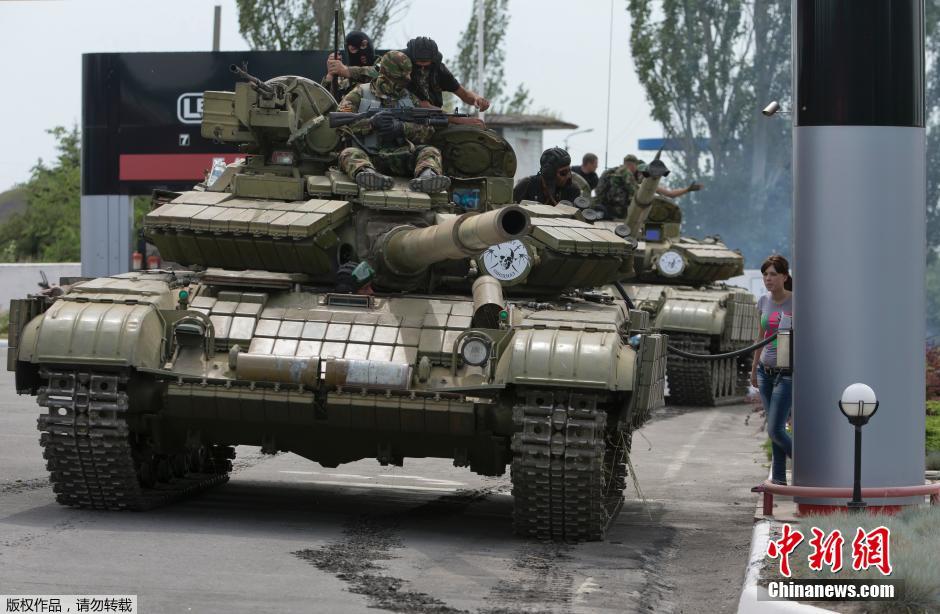 当地时间7月17日,顿涅茨克地区,“顿涅茨克共和国”士兵在街头给坦克加油,一位女孩在加油站帮助他们。