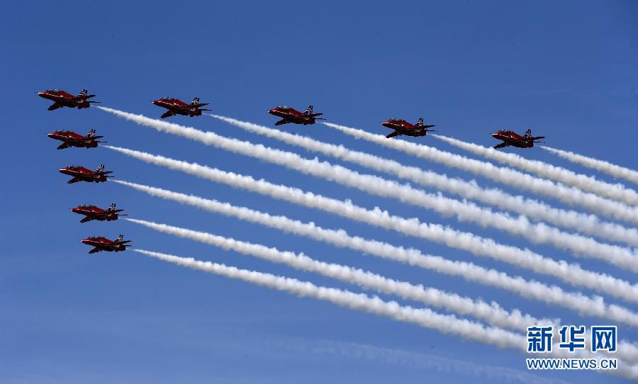 7月19日,欧洲“百年灵”飞行表演队在英国法恩伯勒航展上进行飞行表演。当日,英国2014年法恩伯勒国际航空展迎来首个公众日,众多航空爱好者来到位于伦敦西南的小镇法恩伯勒观看精彩的飞行表演。 新华社记者殷刚 摄