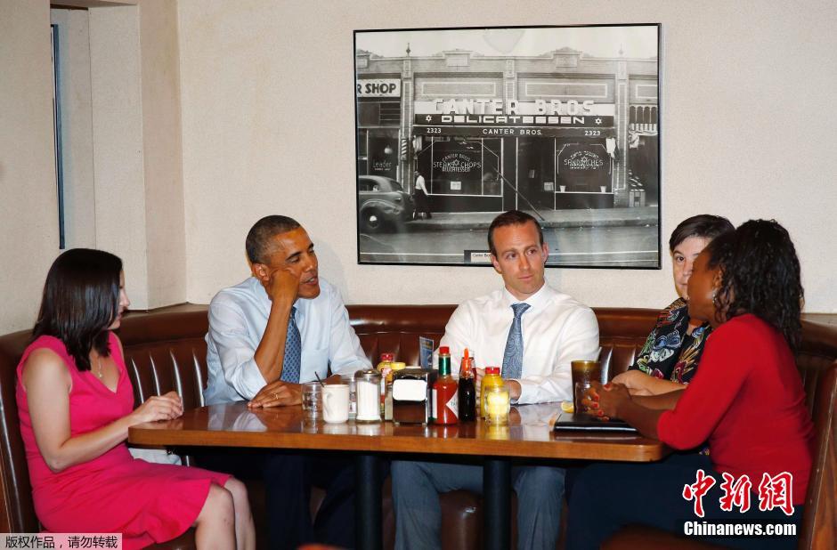 当地时间2014年7月24日,美国总统奥巴马与跟其写信的美国民众在洛杉矶的一家餐厅内见面聊天。