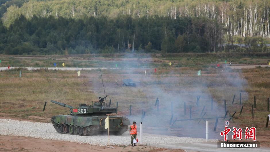 8月4日,俄罗斯“坦克两项-2014”国际竞赛在莫斯科郊区阿拉比诺靶场拉开帷幕。中国队坦克手当天驾驶国产96A型坦克,以绿色迷彩配红色国旗亮相。在当天午间进行的对坦克目标、直升机目标、反坦克榴弹发射器目标等的射击项目中,中国队全部命中目标。图为中国坦克单车赛出发。中新社发 贾靖峰 摄