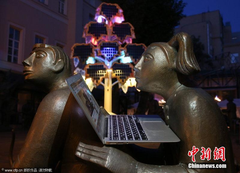 近日,俄罗斯莫斯科,莫斯科现代艺术博物馆外放置一个巨型的无线网络“树”,“树”上安装着太阳能板。游客可以享用免费的无线网络服务。图片来源:CFP视觉中国