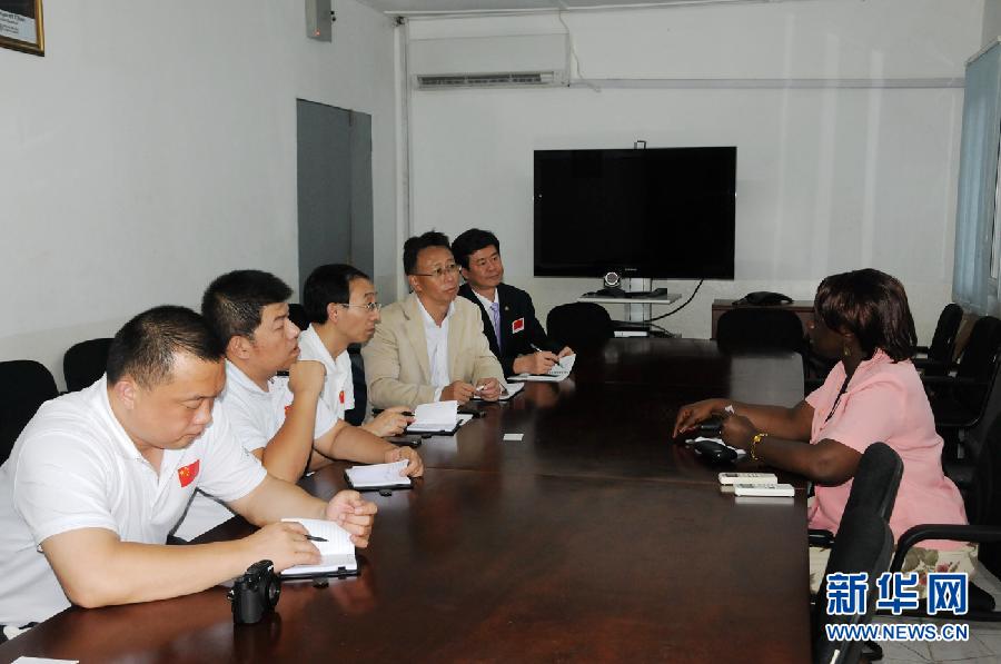 8月13日,在塞纳利昂首都弗里敦,世界卫生组织塞拉利昂代表处疾病预防和控制医学官路易萨·甘达(右)向中国专家组介绍塞拉利昂埃博拉疫情。当日,中国支援塞拉利昂公共卫生专家组一行三人先后会晤了世卫组织驻塞拉利昂代表雅各布·姆丰达和世卫组织驻塞拉利昂代表处负责疾病预防与控制的医学官员路易萨·甘达。姆丰达称赞中国对塞拉利昂抗击埃博拉疫情的物资援助高效及时,认为中国政府的物资能在一定程度上缓解医疗设备短缺的情况,有助于塞拉利昂更快战胜埃博拉疫情。新华社记者林晓蔚摄