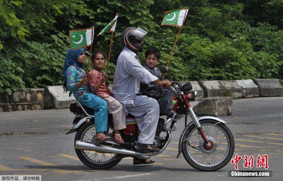 当地时间8月14日,巴基斯坦伊斯兰堡,民众骑摩托车举着国旗庆祝巴基斯坦独立68周年。