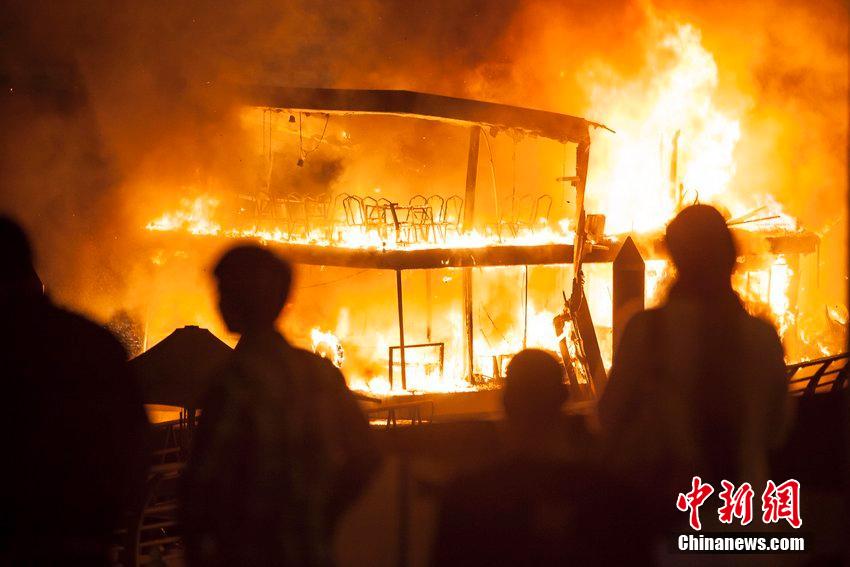 当地时间2014年8月14日,阿联酋迪拜码头,一艘餐厅船发生火灾,熊熊火焰将整个船体烧毁。在船内就餐的食客被迫跳窗逃生。图片来源:CFP视觉中国