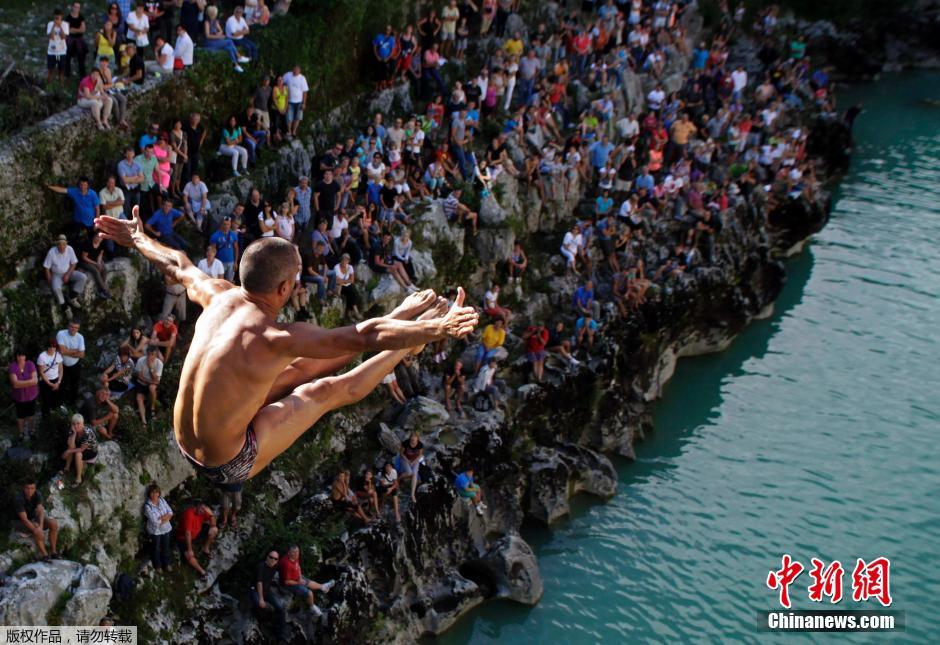 当地时间2014年8月17日,斯洛文尼亚Kanal ob Soci,当地民众参加一项跳桥比赛。