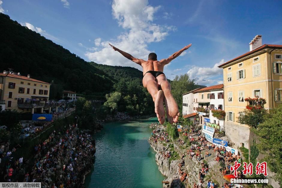 当地时间2014年8月17日,斯洛文尼亚Kanal ob Soci,当地民众参加一项跳桥比赛。
