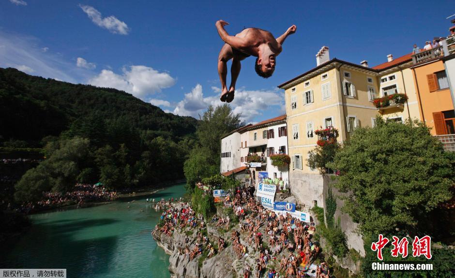 当地时间2014年8月17日,斯洛文尼亚Kanal ob Soci,当地民众参加一项跳桥比赛。