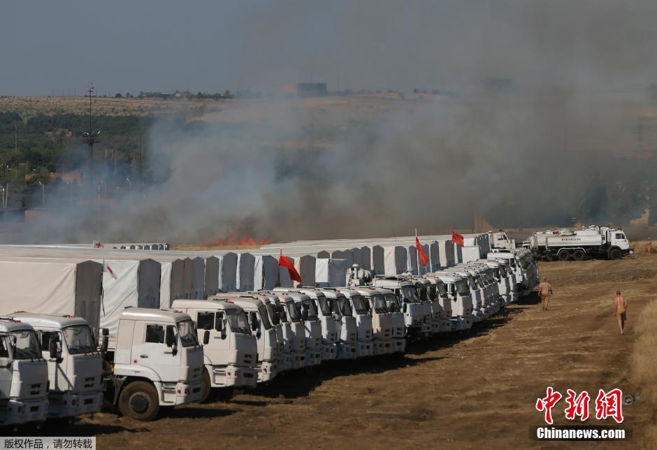 当地时间8月14日,俄罗斯罗斯托夫地区,向乌克兰东部运送救援物资的车队抵达距离俄乌边境约30公里的一处营地。