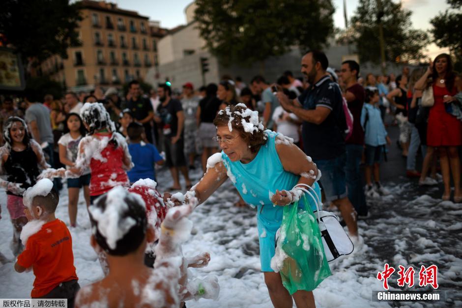 当地时间8月15日,西班牙马德里,人们参加一年一度的帕罗玛圣母节活动,消防员在街头给人们送上一场泡沫浴。