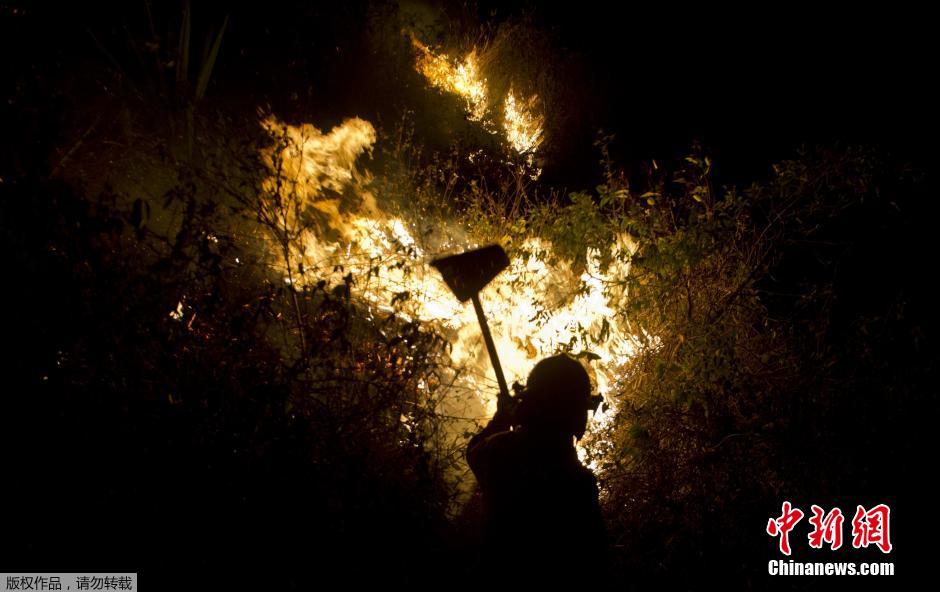 当地时间2014年8月15日,哥伦比亚Yumbo发生森林火灾,消防员连夜灭火。