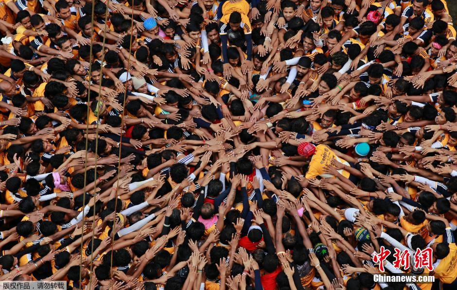 印度教教徒庆祝神灵诞辰 年轻人搭建人肉金字塔
