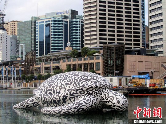 当地时间8月20日,澳大利亚悉尼达令港海面上浮现一个巨大的充气海龟——“阿尔法巨龟”,吸引人们驻足海边观看拍照。中新社发 沙长华 摄
