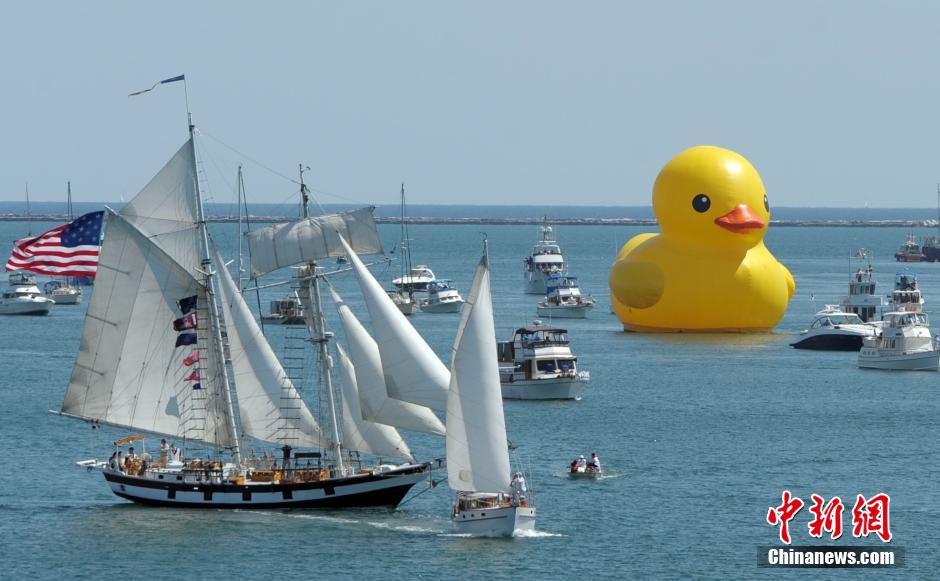 当地时间8月20日,世界闻名的大黄鸭“游到”洛杉矶长滩,为这里举行的高桅杆帆船节助兴。中新社发 毛建军 摄