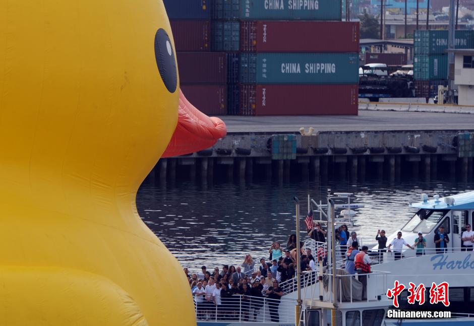 当地时间8月20日,世界闻名的大黄鸭“游到”洛杉矶长滩,为这里举行的高桅杆帆船节助兴。中新社发 毛建军 摄
