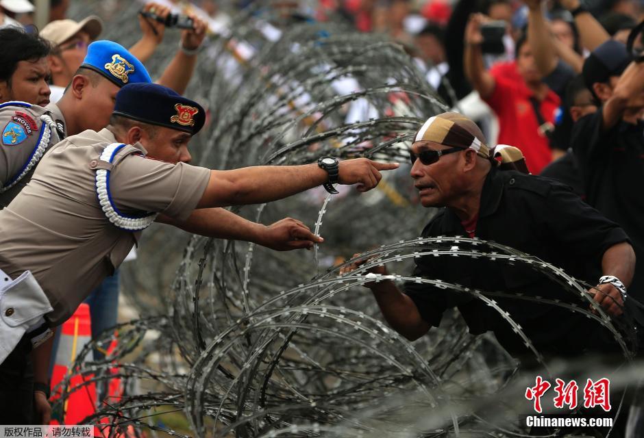 当地时间2014年8月21日,印尼雅加达,总统候选人普拉博沃的支持者聚集与治安人员发生冲突。印尼宪法法院将就总统候选人普拉博沃挑战选举结果作出最终的、有约束力的裁决。当天,警方宣布雅加达处于一级戒备状态,用铁丝网封锁了通往法院的交通要道,并出动21000名治安人员维持治安。