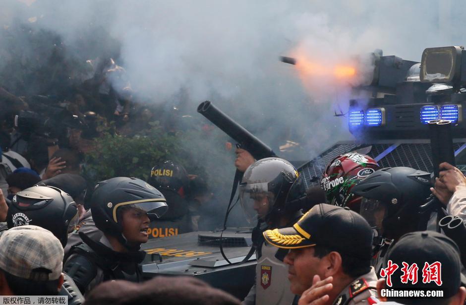 当地时间2014年8月21日,印尼雅加达,总统候选人普拉博沃的支持者聚集与治安人员发生冲突。印尼宪法法院将就总统候选人普拉博沃挑战选举结果作出最终的、有约束力的裁决。当天,警方宣布雅加达处于一级戒备状态,用铁丝网封锁了通往法院的交通要道,并出动21000名治安人员维持治安。
